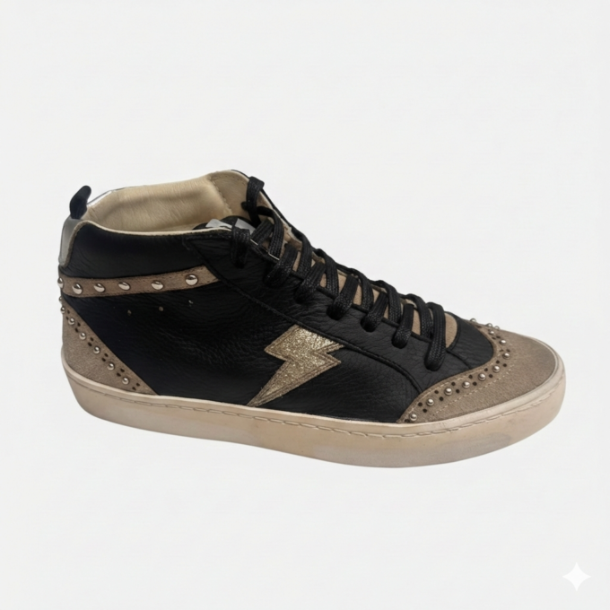 Zapatilla de Cuero Negro, Nobuck Gris y detalles en Cuero Plata. Rayo cuero metalizado Plata, Cordones en algodón encerados. Forro Cuero Vacuno. Suela de caucho, banda cosida, que asegura el pegado para toda su vida útil. Plantilla de 17 mm en Goma EVA, Comodidad suprema.